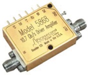 The Model PSPL5868 driver amplifier is intended for use as a modulator driver or as a linear amplifier. This device includes internal temperature compensation for excellent output stability over temperature, and exhibits both high output and low power dissipation. It also incorporates internal sequencing circuitry, making it insensitive to power supply application sequence.