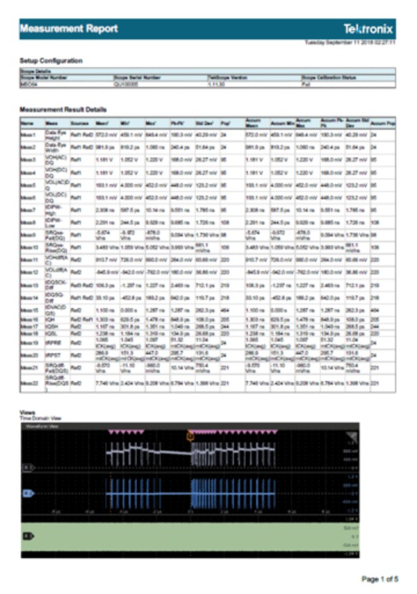 自动生成报告,以 .MHT、.CSV 或 .PDF 文件格式保存测量数据、测试结果和波形图像。CSV 格式可帮助根据用户的需求解析和自定义测试报告
