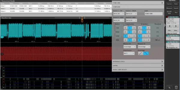 内存调试过程中的第一步是定义搜索。这可以通过单击示波器上的“搜索”按钮并对读突发脉冲或写突发脉冲定义 DDR 搜索来实现。下一步是从 DDR 选项卡添加测量,并配置这些测量。此配置过程涉及提供搜索以作为测量的输入,以及定义信号源。由于要配置众多测量,所以我们建议手动配置一次测量 ,并保存示波器设置文件。当您下次想要调试时,可以很容易地调出波器设置文件,这将恢复示波器的所有已配置测量,并可根据需要进行编辑。