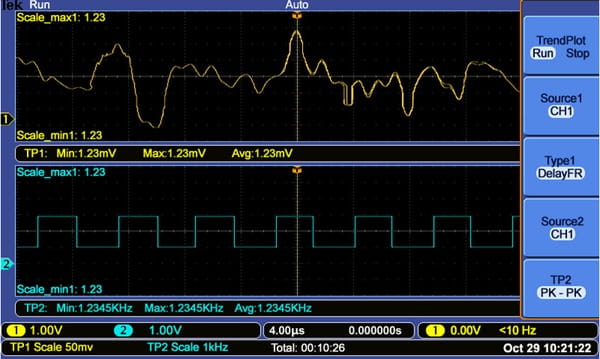 间歇性问题可能很难评估,因为它们不会经常重复,因此很难捕获。 TrendPlot™ 功能在长时间周期内绘制测量值,帮助找到这些问题。 选择在任意一条通道或两条通道上要捕获的测量,然后设置示波器,连续监测这些测量,在显示画面上绘制数据,同时把信息保存到 U 盘中。 视不同的示波器设置,您将能够捕获几分钟、几小时、甚至几天的数据,唯一的限制是 U 盘的容量。