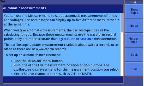 内置帮助菜单为您提供与示波器的特性和功能有关的重要信息。 提供的帮助语言与用户界面相同。