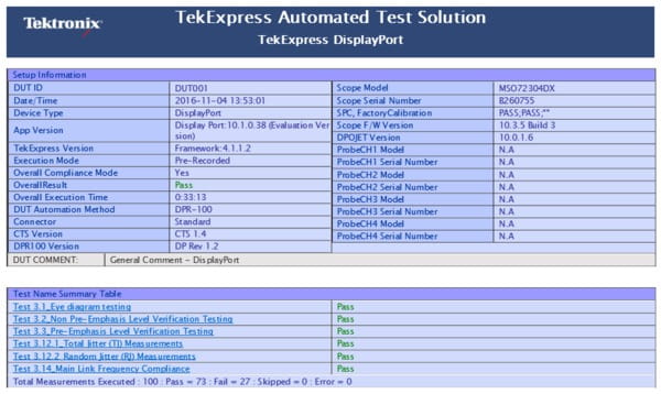 TekExpress 为标准和 C 型 DisplayPort 一致性测试提供自动测试支持。新的高级 TekExpress DisplayPort 应用利用最新的 TekExpress 4.0 框架的特性,把整体测试效果优化了近三倍。