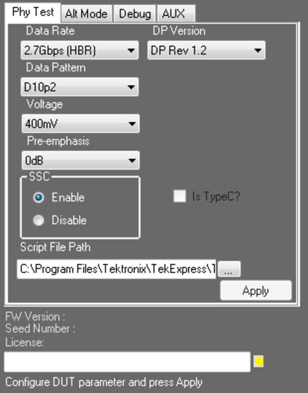 这种新工具在运行一致性测试前帮助您检验设置连接和 DUT 特点,与 TekExpress DP 1.4 安装程序捆绑在一起提供。这种工具控制 DPR-100 辅助控制器,改变 DUT 设置,如数据速率、码型和电平。这种工具还作为 DisplayPort Type-C 设置的一部分,帮助控制 PD 控制器。