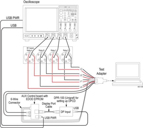 这通过把 C 型 DUT 从默认模式 (USB) 置于 DisplayPort 模式,根据功率传送规范通过 CC (配置通道)线路交换一串 PD 信息来实现。这要求在设置中有一个 USB PD 控制器。一旦这个控制器协商消息,DUT 进入 DisplayPort 模式,它可以使用第二个控制器(测试模式控制器)进行控制,改变 DUT 配置(控制数据速率、码型、幅度、预加重等)。