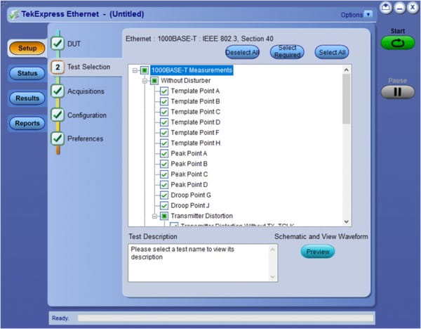 手动执行所有测量需要耗费的时间特别长。TekExpress 以太网软件提供了一个自动化框架,可以用更少的用户干预执行所有测量,比如在需要改变连接时。