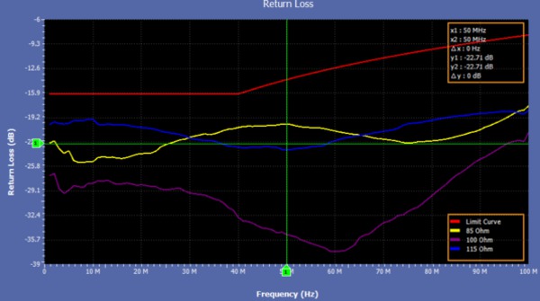电缆系统的回波损耗会影响系统的互操作性。以太网标准定义了反射信号相对于偶发信号的最低衰减量。回波损耗测试测量阻抗,一般在100 Ω ±15%范围内。TekExpress 以太网巧妙地执行标准规定的 85、100 和 115 Ω(10BASE-T 为 111 Ω)阻抗的回波损耗测试,将 5/6 系列 MSO 和 AFG/AWG 用于其他测试,提高资源利用率。