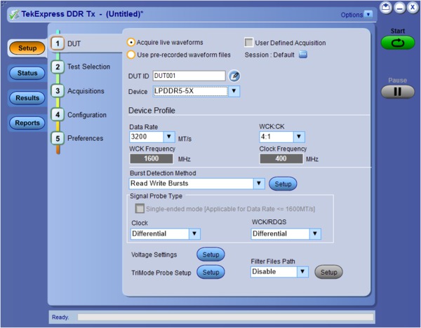 The TekExpress DDR Tx application provides a simple, step-by-step, and easy-to-use interface to speed up the testing process. User can select the memory technology of interest in Device, Data Rate, Burst Detection Method, select the probing configuration used for Clock, and strobe in the Setup DUT panel. Perform the test selection in the next step as per the measurement group (Clock, Command Address, Data Strobe, and Data for both Read and Write traffic (or bursts)) and individual measurements within the group provide different methods of Burst detection.