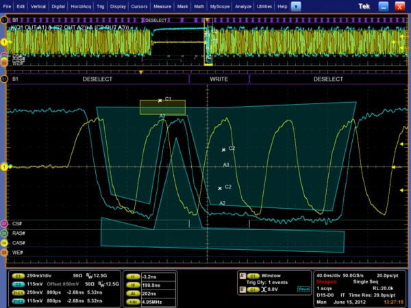 混合信号示波器可以在内存总线和触发器上探测更多信号和查看特定总线事件。通过米乐m6网页版登录入口 MSO5000 或 MSO70000 系列示波器,可以使用多达 16 条数字通道来查看命令和地址信号的逻辑状态,如 RAS、CAS、WE、CE 或 CS。