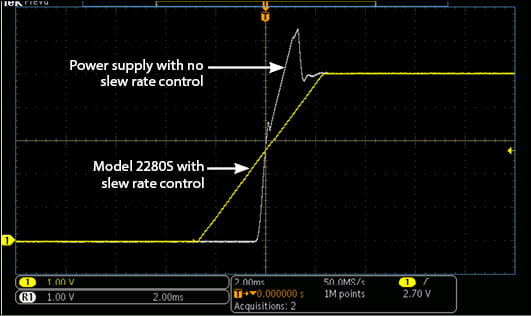 您的设备或系统是否在高涌入电流下工作?2280S系列 电源允许对电压输出上升时间进行编程,从而减缓电压斜线 上升,避免电压过冲,因为电压过冲有可能损坏待测器件。 此外,还可以对电压下降时间进行控制,以避免输出电压的 快速下降。电压上升和下降时间,可以设置为10V/s或100V/s。 对于微小的电压变化,可以将上升和下降时间设置为1000V/s。