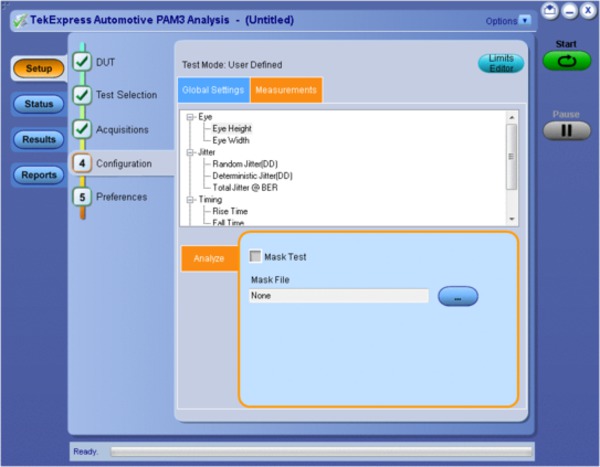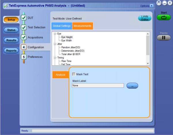 PAM3 测量配置: PAM3 分析工具内部的配置面板可以配置运行 PAM3 分析所需的大多数单元。设置工具包括选择测量来源、时钟恢复和阈值配置。