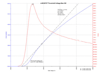 The red plot line shown here illustrates the transconductance (gm) and the maximum transconductance value (Vth).