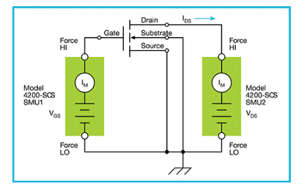 The approach shown in the first configuration calls for three source measure units (SMUs), allowing every node to be held at a feedback-controlled voltage and every current to be measured simultaneously. If you don’t have enough SMU channels to cover each device channel connection, it is possible to proceed as shown in the second configuration. It should be noted that this configuration is more susceptible to a noisy ground connection and can produce ground loops if long cables are used. Also, the current and voltage at the source terminal cannot be measured, which can lead to errors in calculations.
