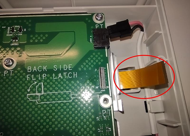 - Disconnect the touch screen cable from the Main board by flipping up the latch on the cable-side of the connector and sliding the cable out of the connector.