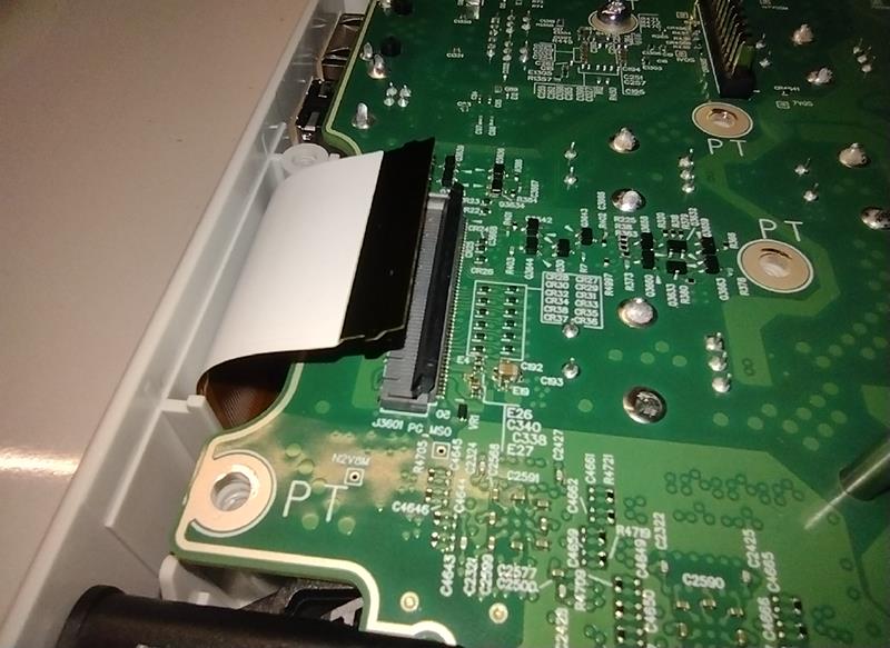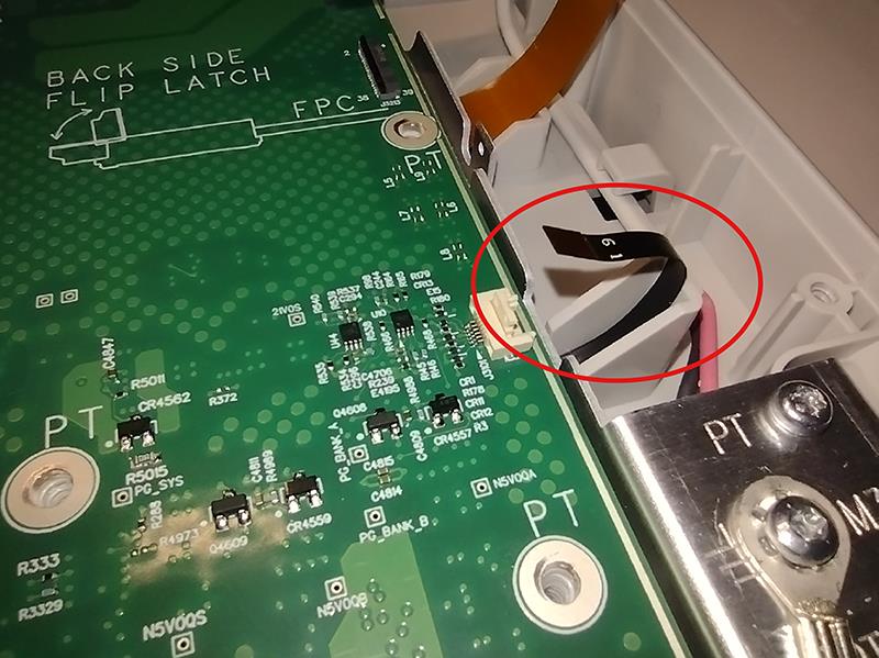 - Disconnect the front panel cable from the Main board by flipping up the latch on the cable-side of the connector and sliding the cable out of the connector. This cable includes hook features, so the cable must be lifted out of the connector while sliding it out.