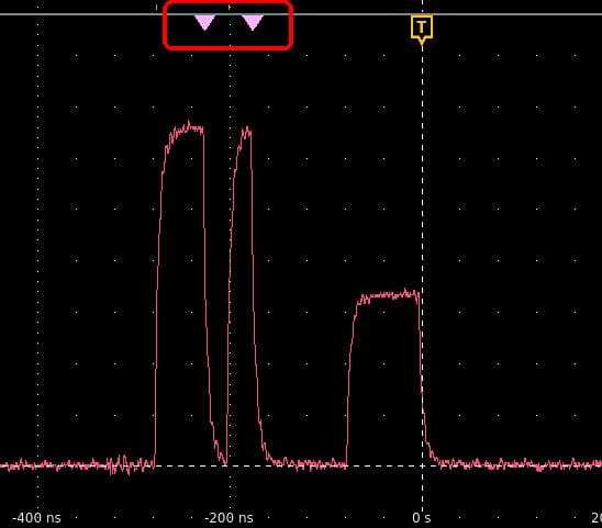 注:您无法搜索序列事件(不存在序列搜索类型)。 - 搜索条件为真后,所搜索到的波形将立即以一个或多个三角形进行标记。每个搜索使用不同的标记颜色。示例图片说明了用于查找宽度小于 70 ns 的正脉冲而设置的搜索条件。