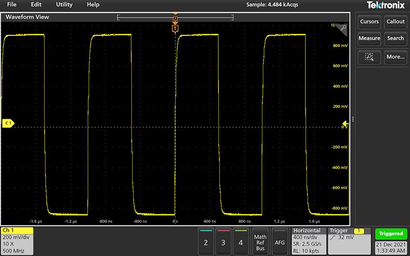 - 要将波形移动至所显示的中心标记,请按下前面板 Run/Stop(开始/停止)按钮以停止采集,然后单击 Search(搜索)标记并点击 < or > 导航按钮。