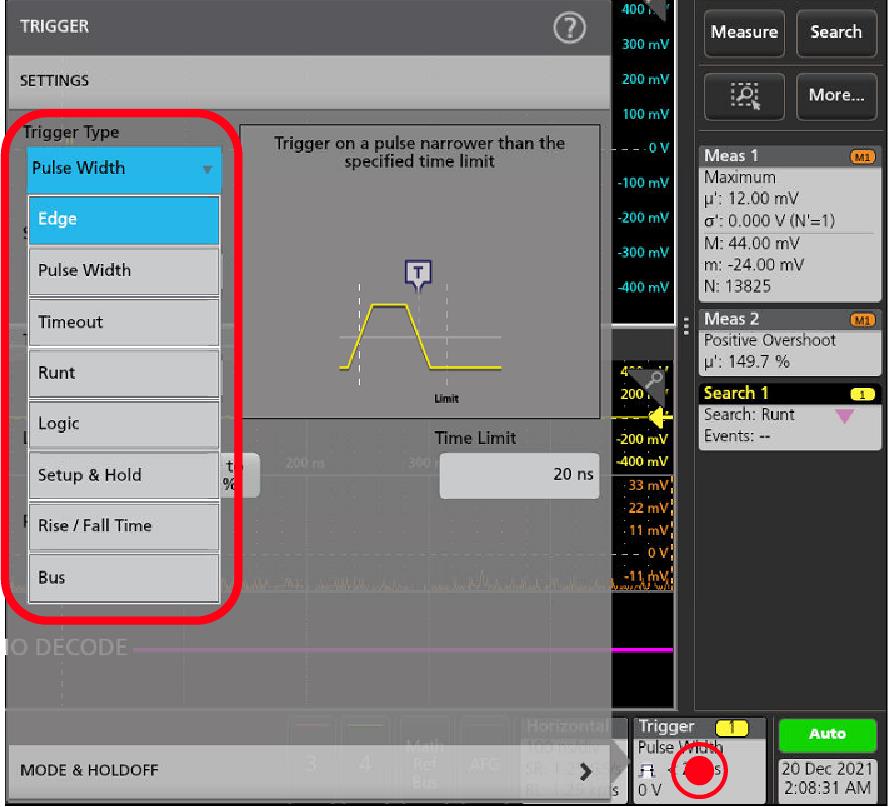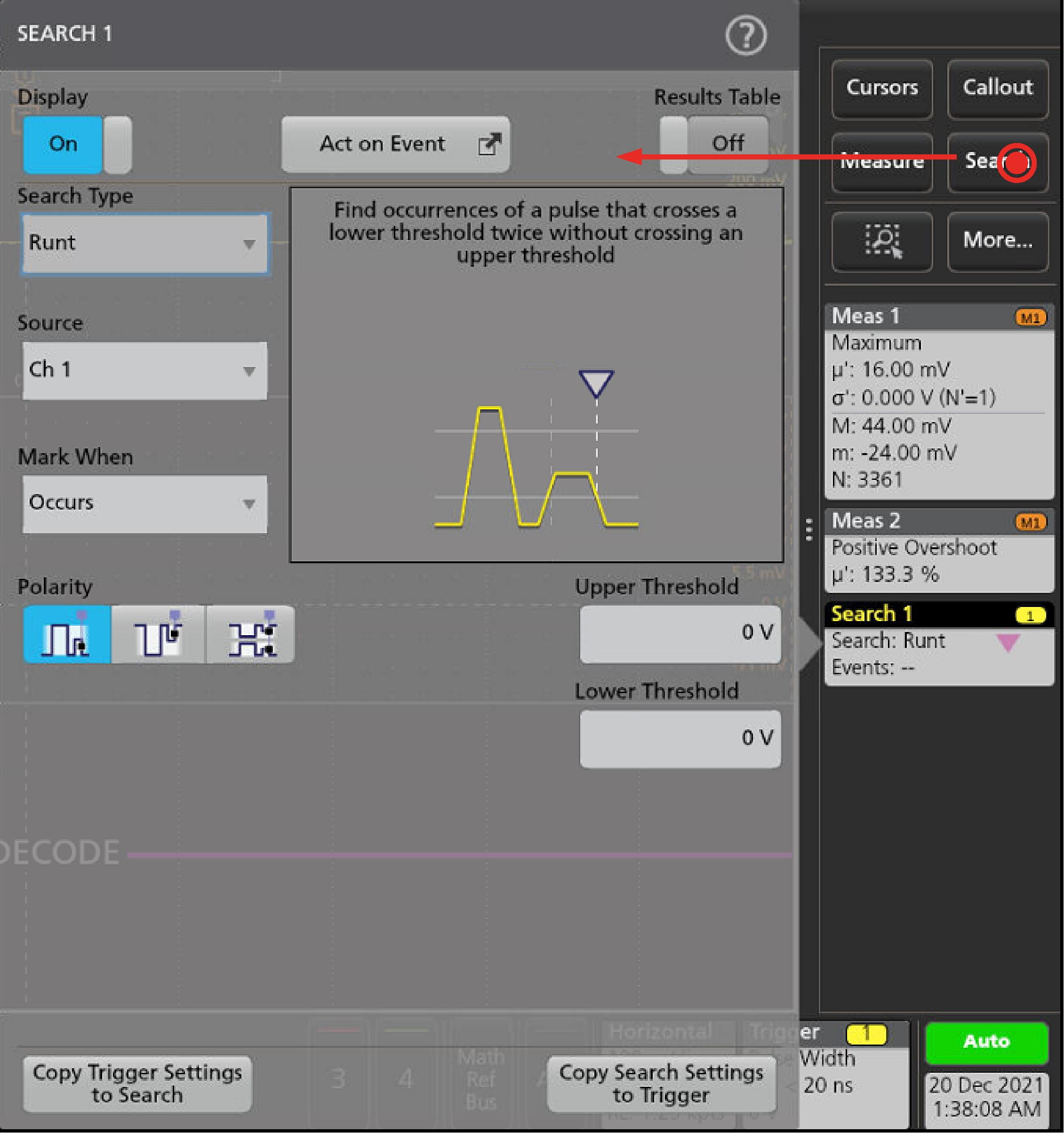 前提条件:显示要搜索的通道或波形信号。必须显示波形才能为其创建搜索。