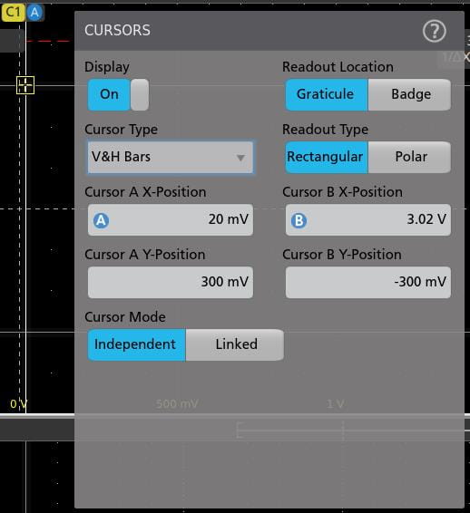 - 要进一步配置光标,请双击光标线或光标读数以打开 Cursors(光标)配置菜单。例如,点击“光标”类型选择要显示的光标,如“波形”、V Bars(垂直条)、H Bars(水平条)或者 V&H Bars(垂直和水平条)。