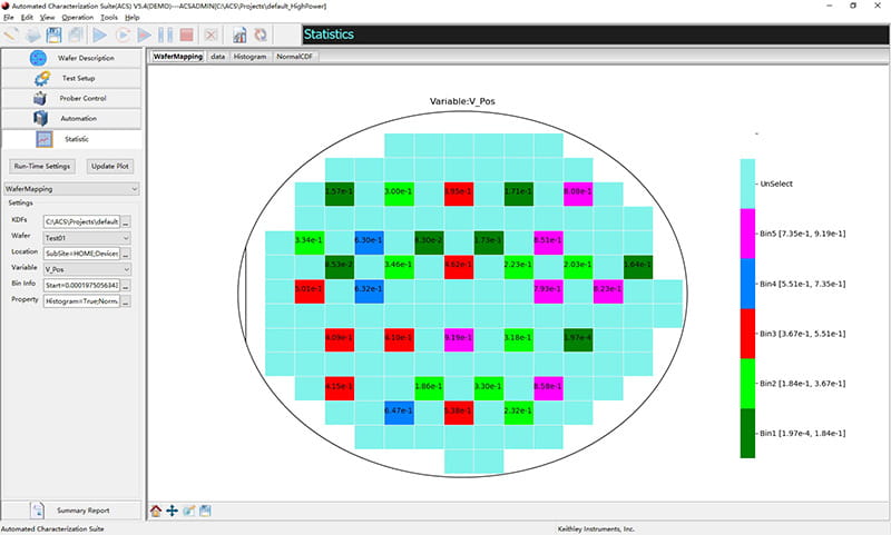 ACS的晶圆探针自动化选项使您能够轻松将各种常用的半自动或全自动晶片探针台连接到测试设置中,从而可以快速捕获大量数据。此选项包括晶片描述实用程序、具有晶片评等功能的实时晶片图、暗盒样品计划实用程序以及测试后暗盒和晶片查看实用程序。ACS 内置的许多工具和功能都可以增强设备的自动检定能力。