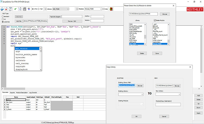 ACS的特点是脚本编辑器,这是一个独立的工具,带有图形用户界面,用于开发Python代码和TSP®脚本,进行仪表控制、数据分析和系统自动化操作。其提供创建和开发 GUI 设计以及管理用户库和模块的直观方法。