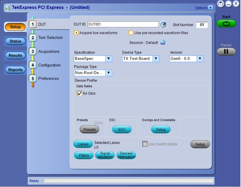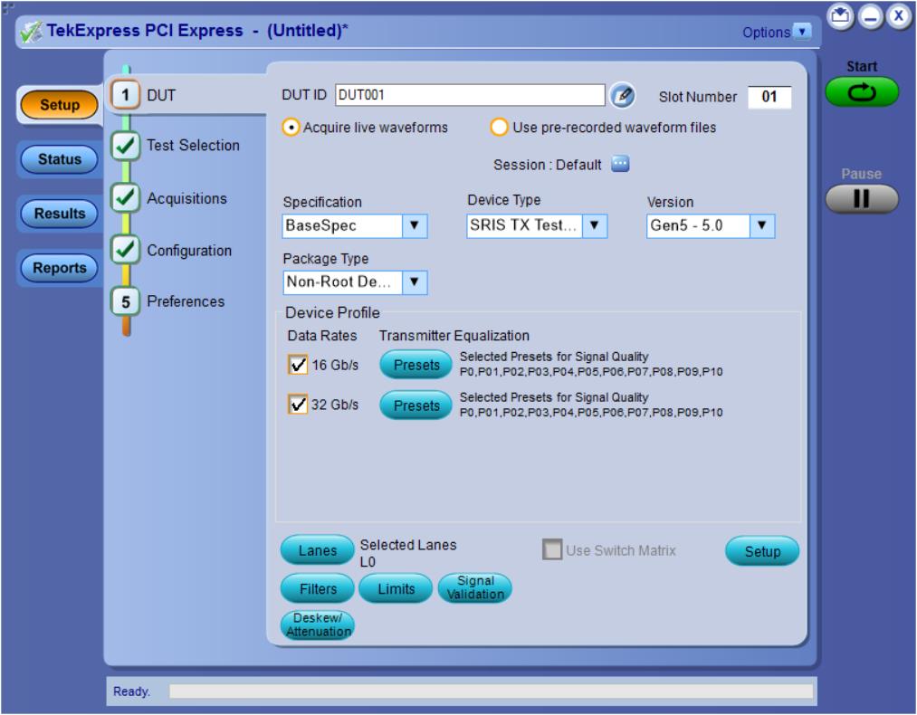 - In DUT panel, select Specification as BaseSpec and Device Type as SRIS Tx Test Board.