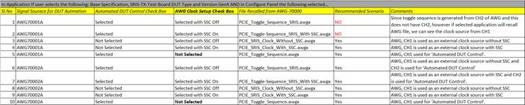 - Based on the selections of the AWG Clock Setup check box, SSC on/Off selection and different combinations of AWG setup files will be loaded on the AWG. These combinations dictate if an external 100 MHz reference clock (with SSC on/Off) on Ch1 of the AWG will be transmitted. The following AWG files loaded as per configuration for Base specification (Device) and DUT Type SRIS Tx Test Board (Suite) for Gen4 and Gen5.